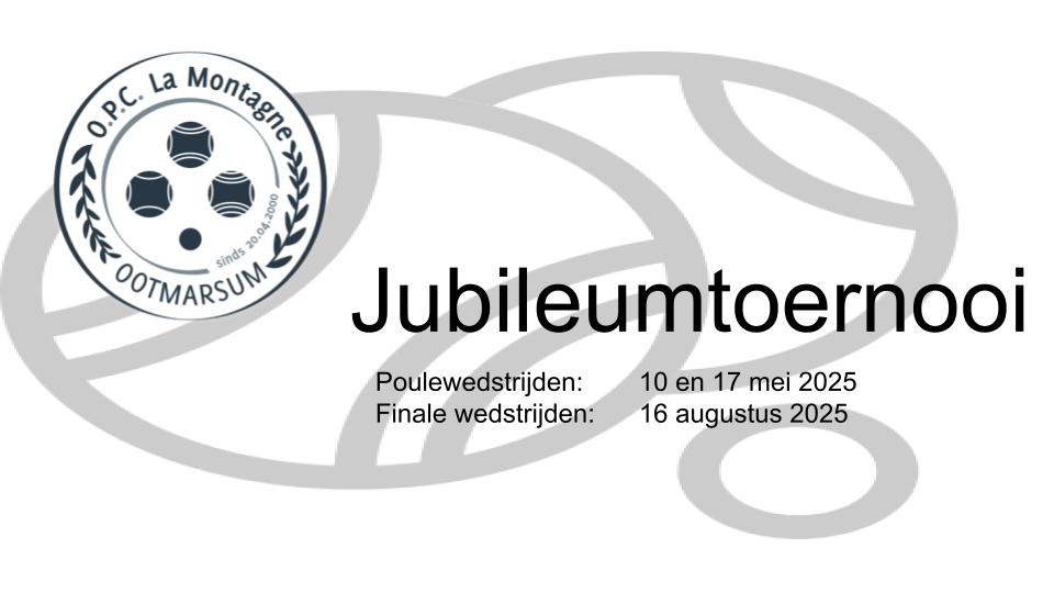 Op 20 april 2025 bestaat onze mooie vereniging 25 jaar. Wij zullen hier diverse keren in 2025 aandacht aan besteden. Een van de onderdelen zal een toernooi zijn tegen omliggende kernen. De poulewedstrijden worden op zaterdag 10 en 17 mei gespeeld. De finale waar alle verenigingen aan mee doen zal op zaterdag 16 augustus 2025 plaatsvinden. Alle wedstrijden beginnen om 13.00 uur. Uiteraard verzoeken wij iedereen ruim van te voren aanwezig te zijn. Zet deze datums alvast in jullie agenda.