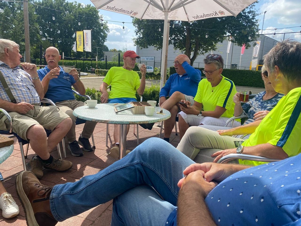 Om de gigantische kater van de laatste plek (8) tijdens ons 25 jarig jubileumtoernooi op 16 augustus weg te werken moest er tijdens de NOT wedstrijd tegen Tubbergen op 20 augustus iets gebeuren. Om gemeenschappelijk op de fiets te stappen richting Tubbergen werd geprobeerd de stemming te verbeteren. Wat ook aardig gelukt is ondanks het vroege tijdstip van 12.00 uur. Men vertrok bij het pand van garagebedrijf Lenferink. De gids die ons naar Tubbergen begeleide woont een paar meter verder op. Tonnie bedankt, zonder jou hulp was het zoeken geweest.